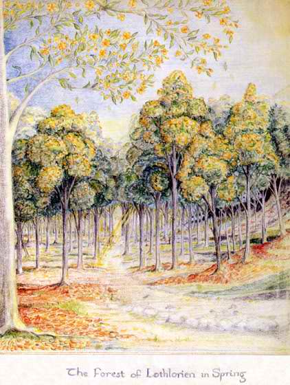 "The others cast themselves down upon the fragrant grass, but Frodo stood awhile still lost in wonder. It seemed to him that he had stepped through a high window that looked on a vanished world. A light was upon it for which his language had no name. All that he saw was shapely, but the shapes seemed at once clear cut, as if they had been first conceived and drawn at the uncovering of his eyes, and ancient as if they had endured for ever. He saw no colour but those he knew, gold and white and blue and green, but they were fresh and poignant, as if he had at that moment first perceived them and made for them names new and wonderful. In winter here no heart could mourn for summer or for spring. No blemish or sickness or deformity could be seen in anything that grew upon the earth. On the land of Lórien there was no stain" (350).